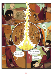 This page’s layout is unique in the book and Stevenson teaches you as you read his work to pay attention to when he varies his otherwise regular layout choices. At this moment in the story, Nimona has shapeshifted into a little boy who is taken to be a disguised Blackheart’s son. The students found the irregular shaped panels with the circular image in the center indicative of the importance of this moment to Nimona and Blackheart’s relationship. Because of her awesome powers, Nimona has never been able to be a child and this page shows the development of a parent/child relationship between the two that will play out as the narrative continues.